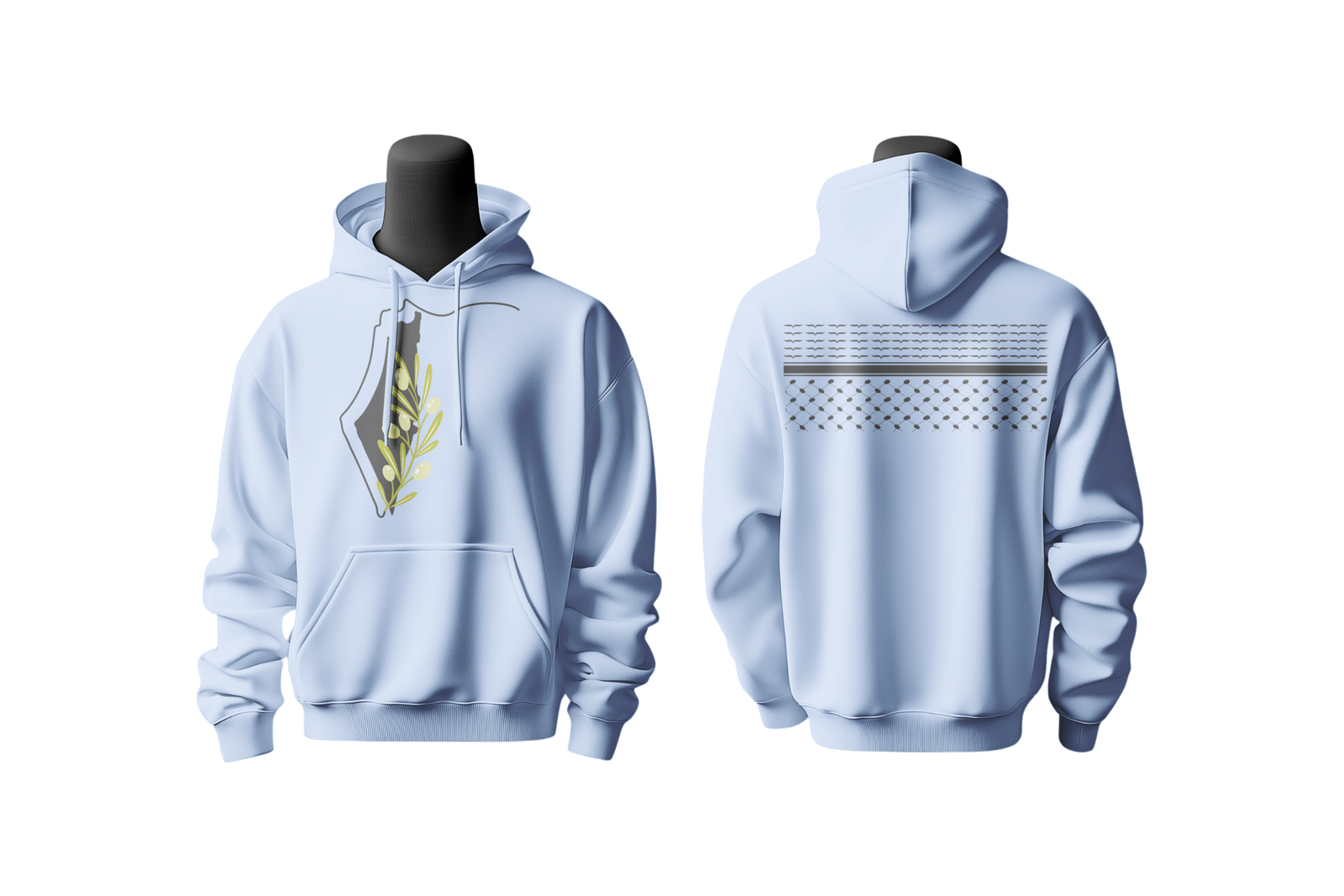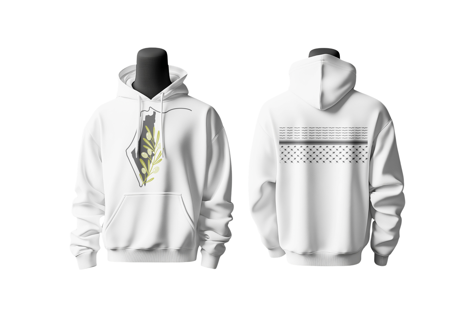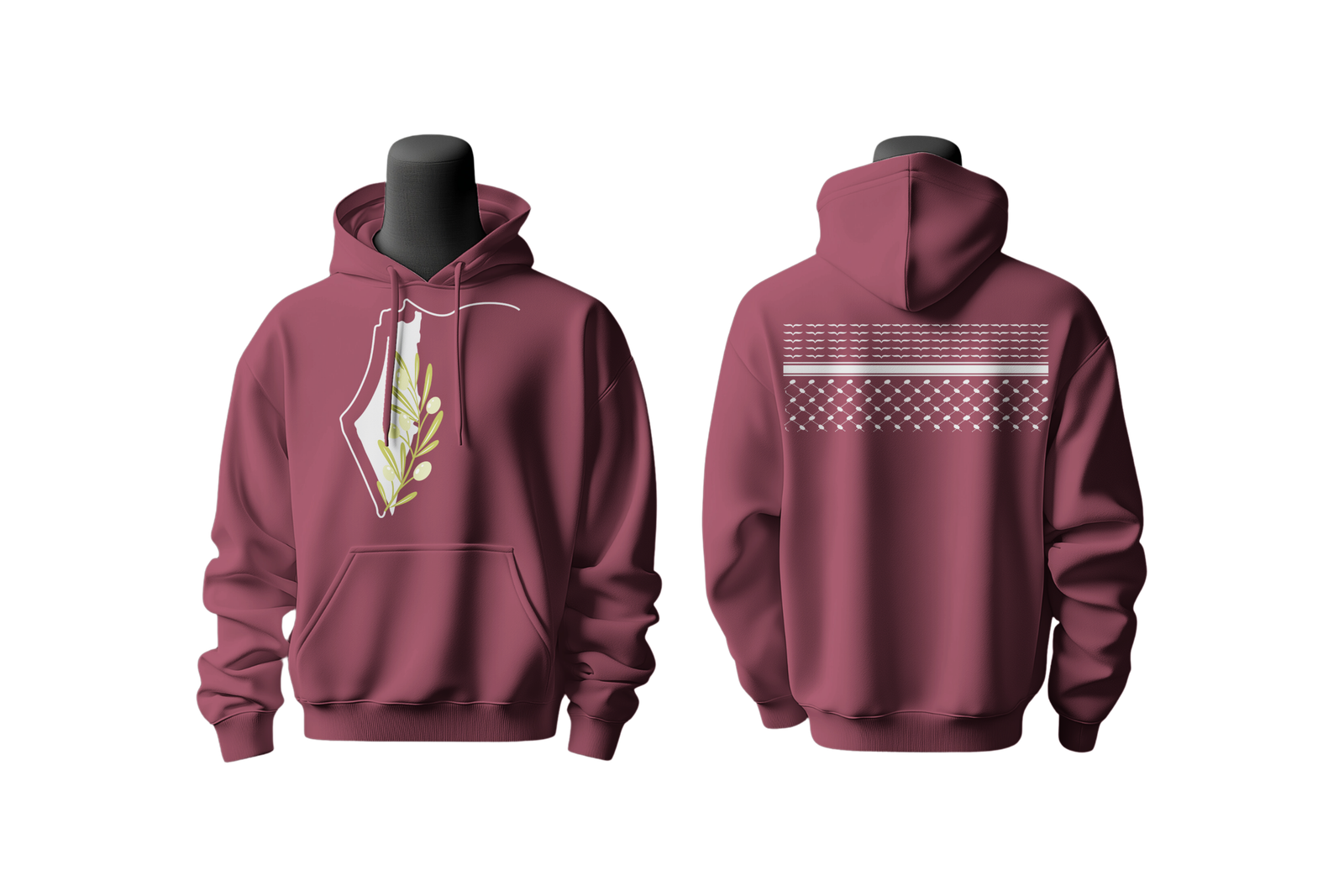 تصميم مستوحى من فلسطين، بورق الزيتون في الأمام والكوفية في الخلف كرمز للأرض والهوية.
